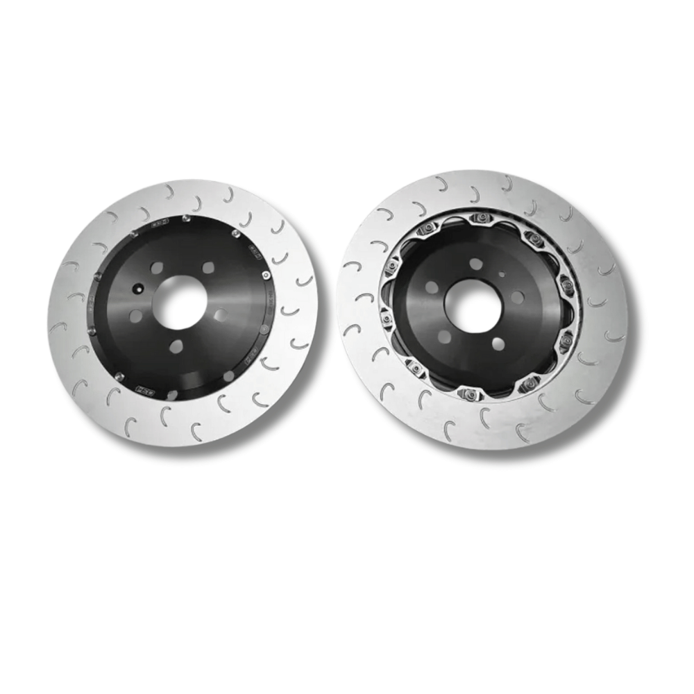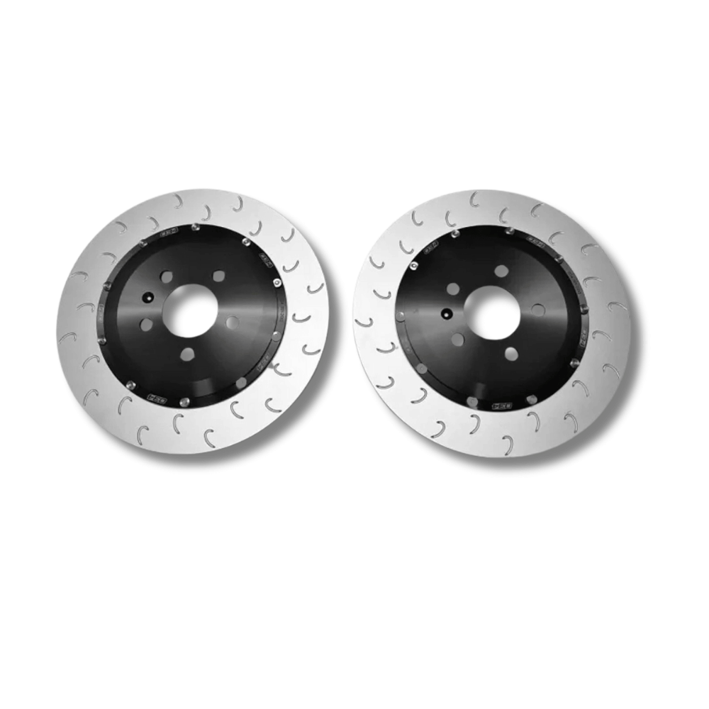 Weighing in at approximately 13.9lbs, each rotor reduces rotational weight by 3.3lbs on each corner over the factory 17.2lbs rotors. While reducing weight, the rotor retains proper thermal mass in the rings to adequately capture, and dissipate heat